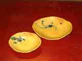 黄瀬戸カレー皿 ・・・ 参考価格 大2枚組 \6,500(木箱入) 大小各1枚 \5,500(木箱入) カレー皿大:長径約 255mm、短径約 215 × 高さ約 60mm カレー皿小:長径約 200mm、短径約 165 × 高さ約 45mm カレー皿として出していますが、イタリア料理屋さんではパスタ皿に、お茶の先生方には菓子鉢としてお茶会の引き出物など多用途に使っていただいてます。 |